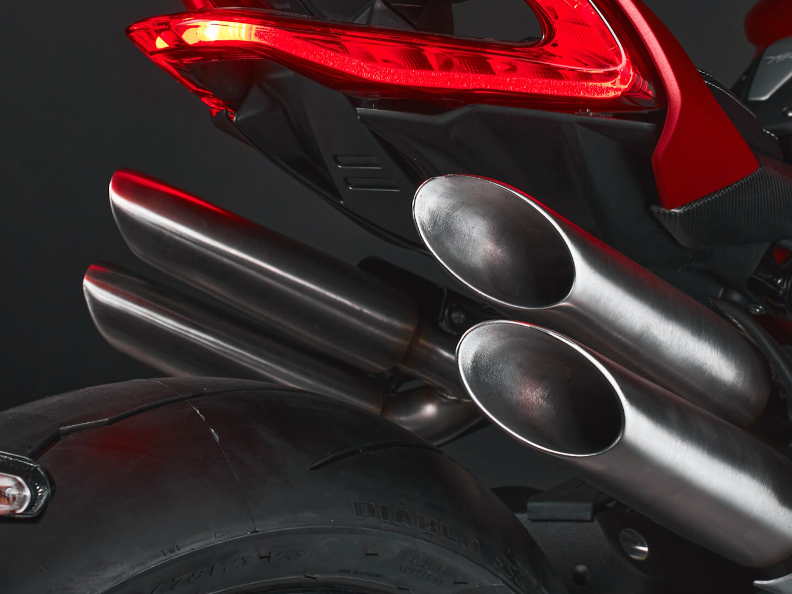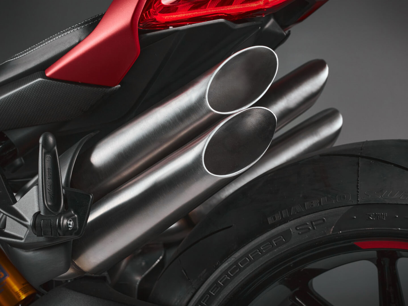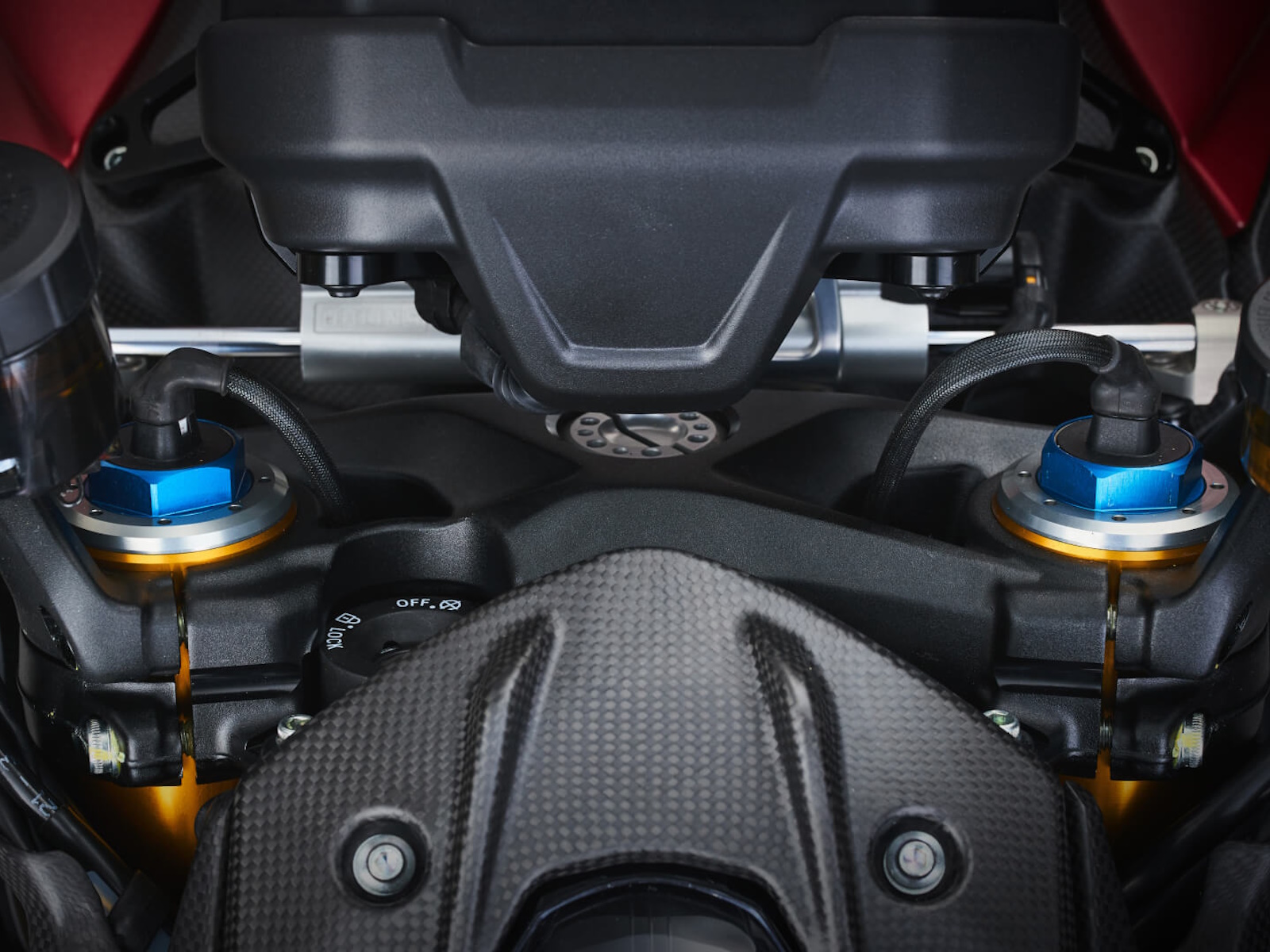The exceptional power of 208 horses has been made even more exciting to handle thanks to the new camshaft timing, which optimises the torque curve at medium/low rpm. Efficiency has been improved thanks to the new transmission gears which reduce friction. The countershaft introduced into the four-cylinder’s crankcase spins at twice the speed of the drive shaft and reduces the high-frequency secondary vibrations by 54%. Increased reliability and more comfort. The transmission has been beefed up and the exhaust has a new main manifold.