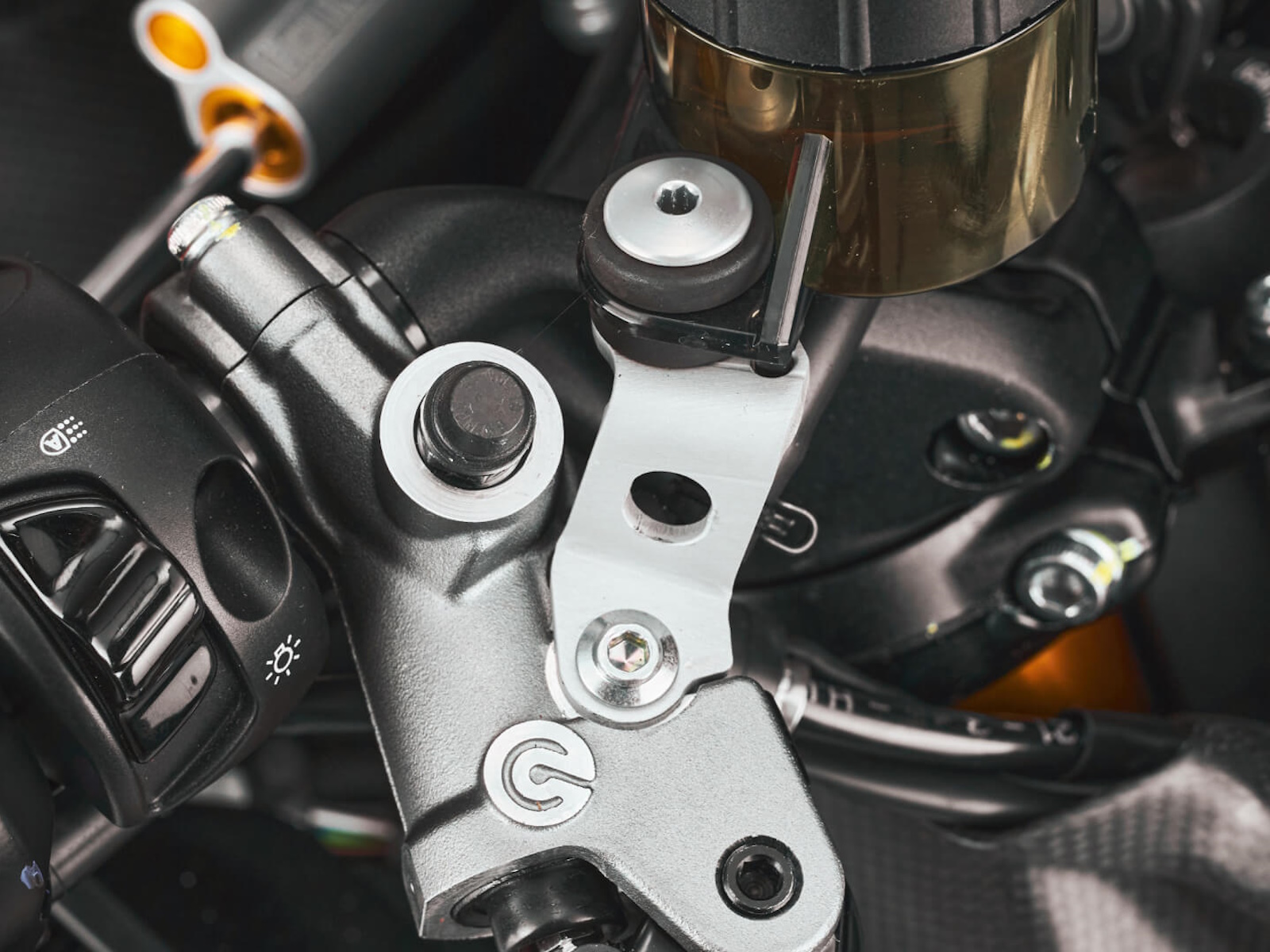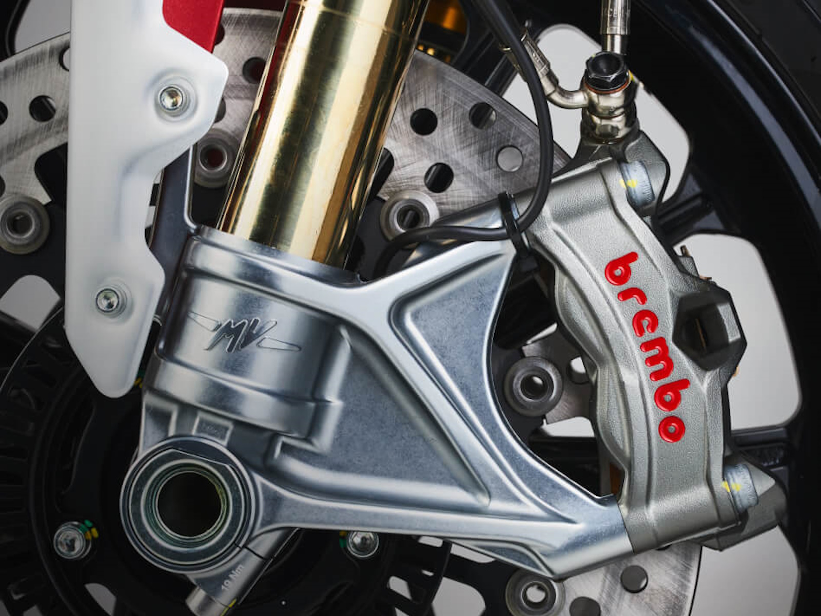 Caliper: Brembo Stylema radial-type, single-piece with 4 pistons Ø 30 mm (Ø 1.18 in.) | Double floating disc with Ø 320 mm (Ø 12.6 in.) diameter, with steel braking disc and aluminium flange - Brembo radial master cylinder/level assembly