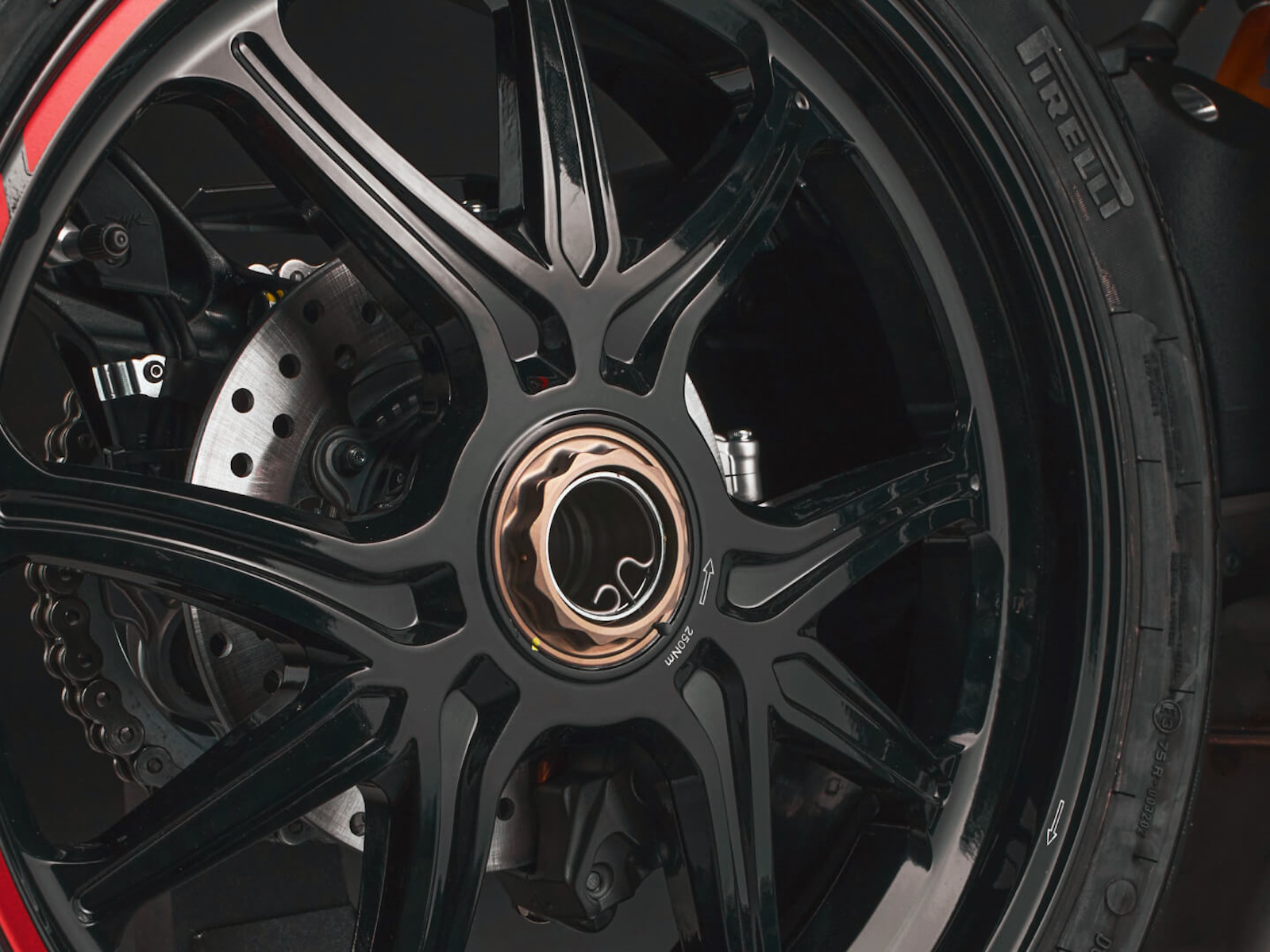 Öhlins Nix EC hydraulic “upside down” front forks with TiN superficial treatment. Completely adjustable with electronically controlled compression and rebound damping with manually controlled spring preload.