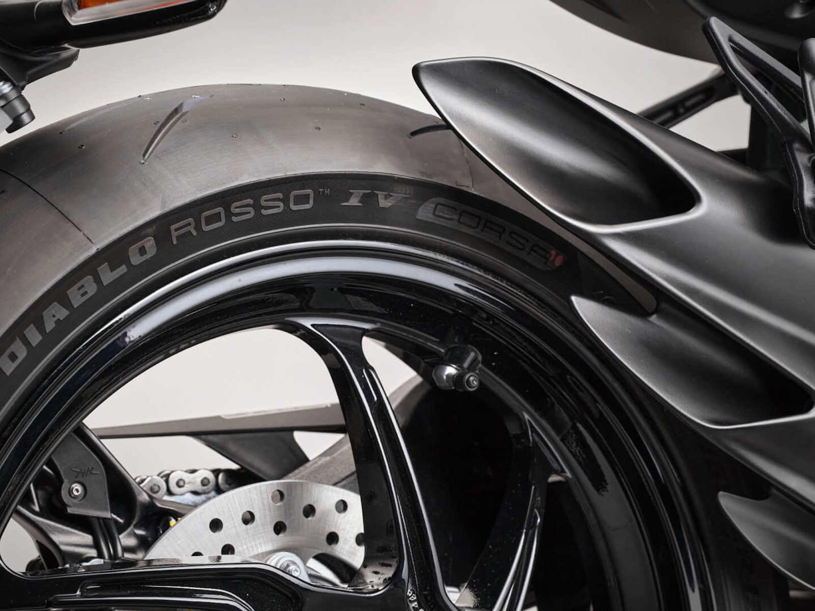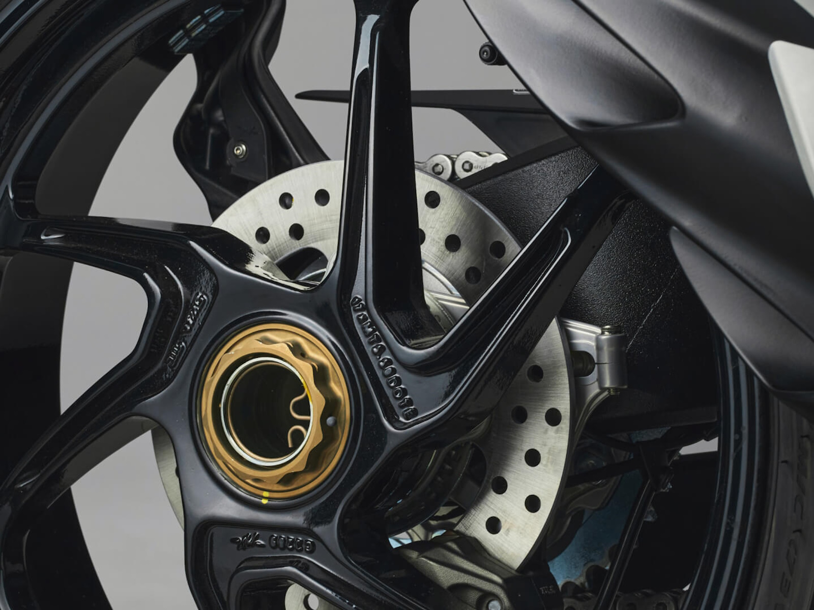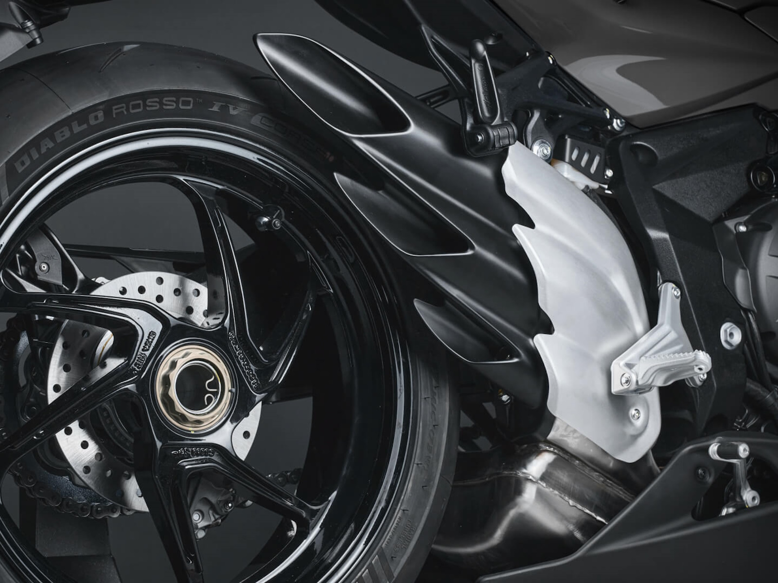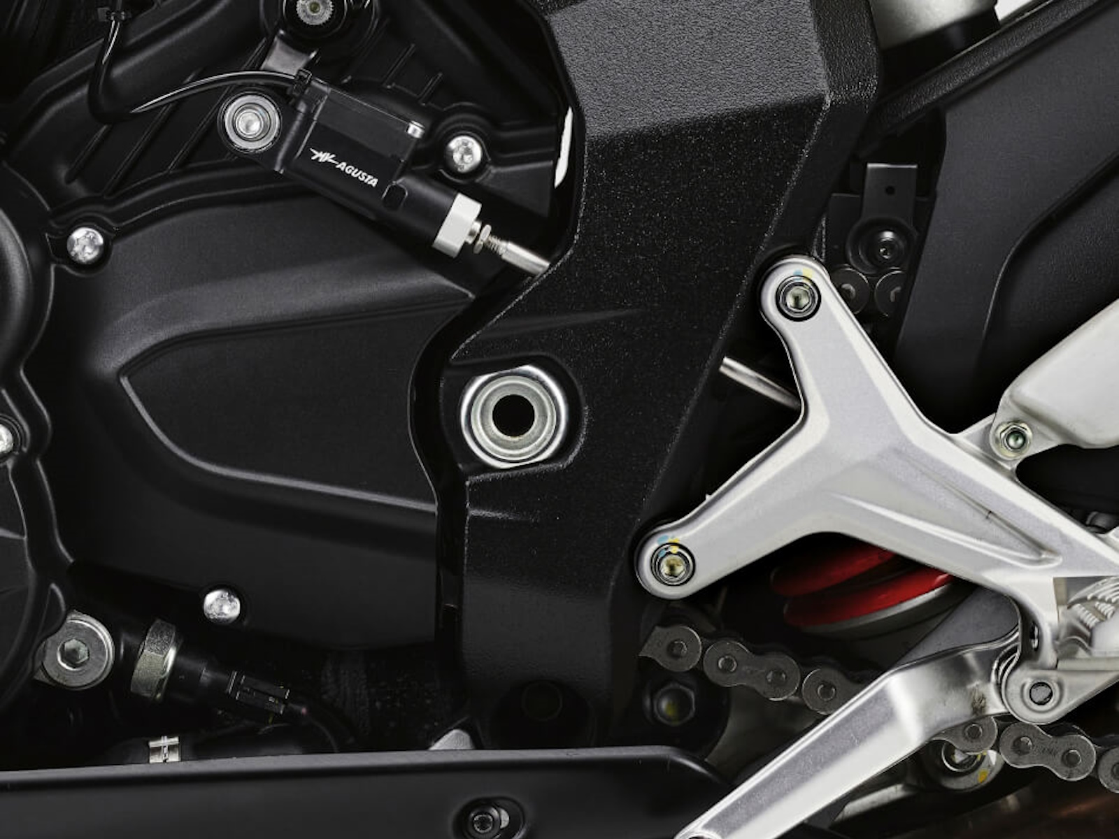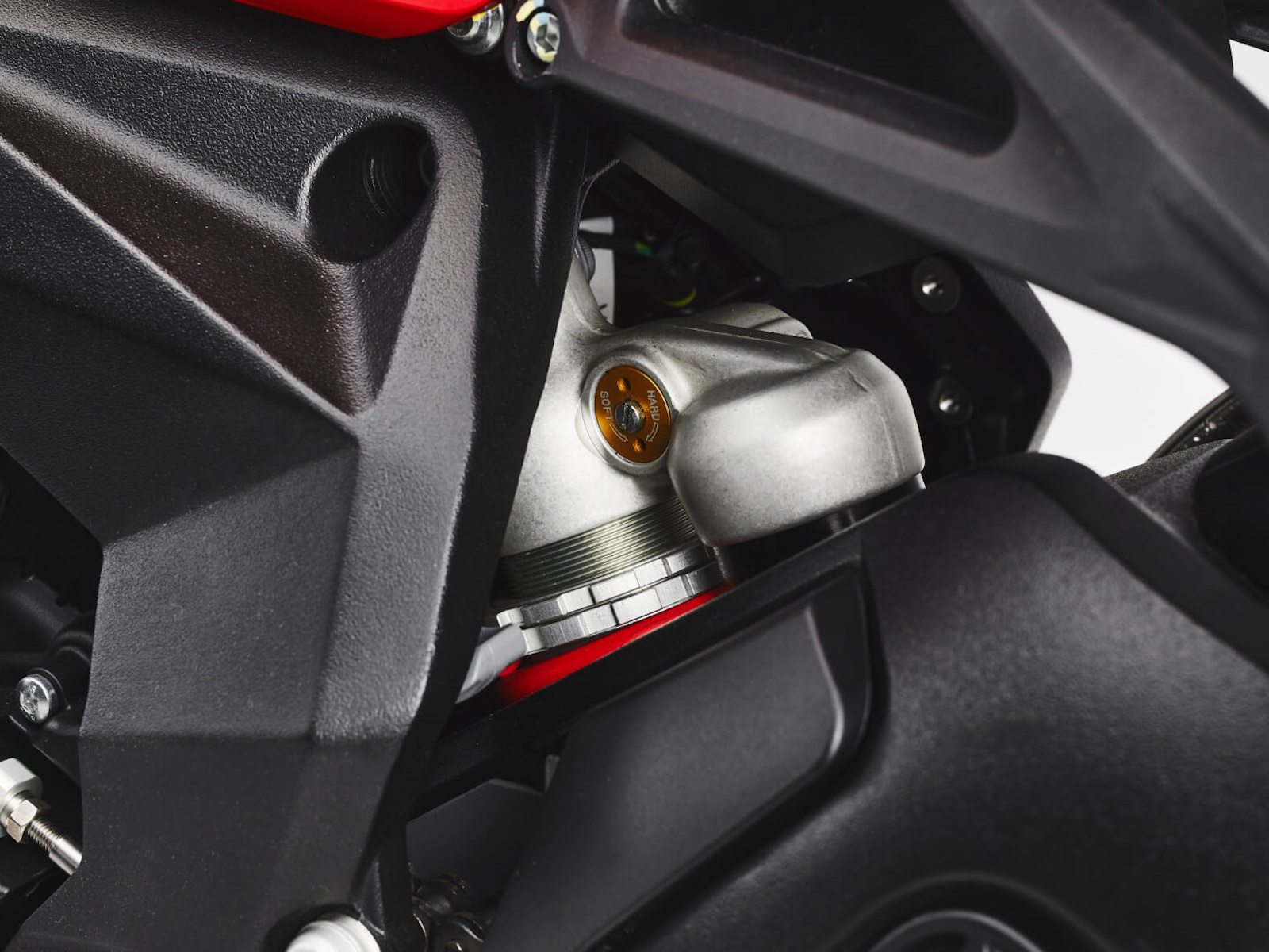 The inline three-cylinder with counter-rotating crankshaft stands out for its elasticity, performance and compactness. Nestled within the steel ALS trellis tube frame with aluminium alloy single-sided swingarm, the compact three-cylinder unleashes 147 hp of maximum power at 13,000 rpm.