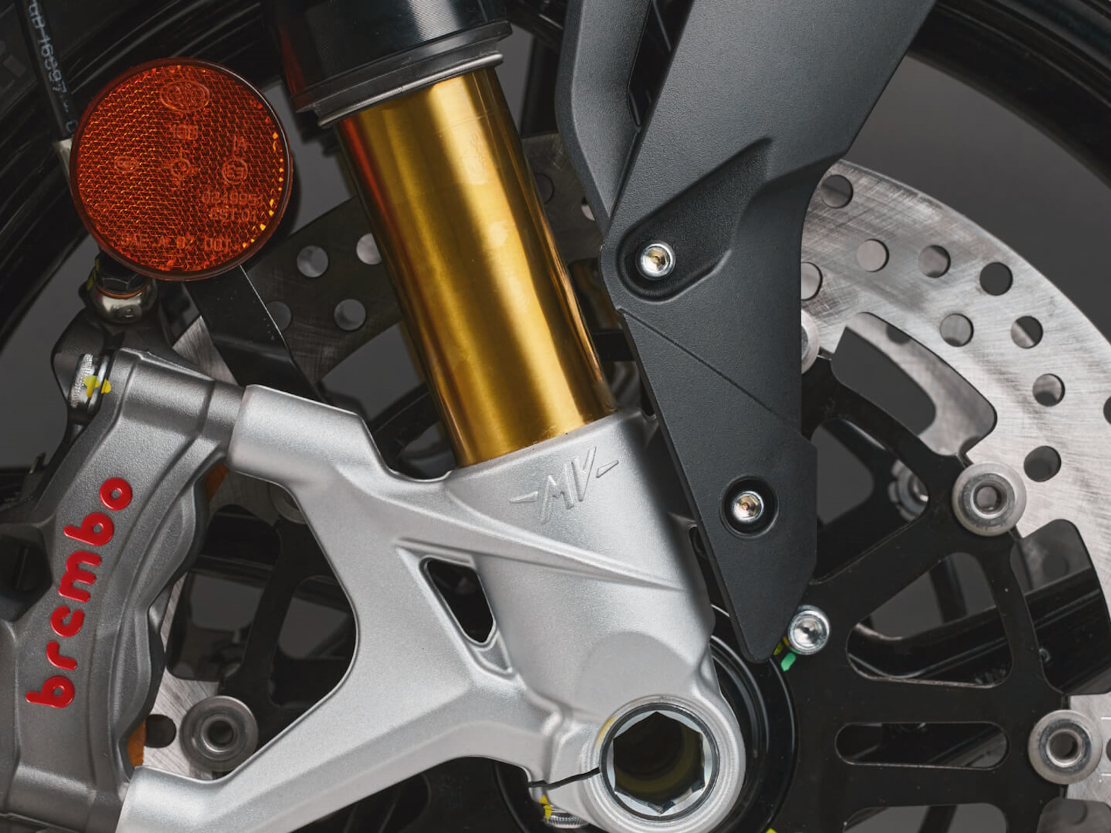 The inline three-cylinder with counter-rotating crankshaft stands out for its elasticity, performance and compactness. Nestled within the steel ALS trellis tube frame with aluminium alloy single-sided swingarm, the compact three-cylinder unleashes 147 hp of maximum power at 13,000 rpm.