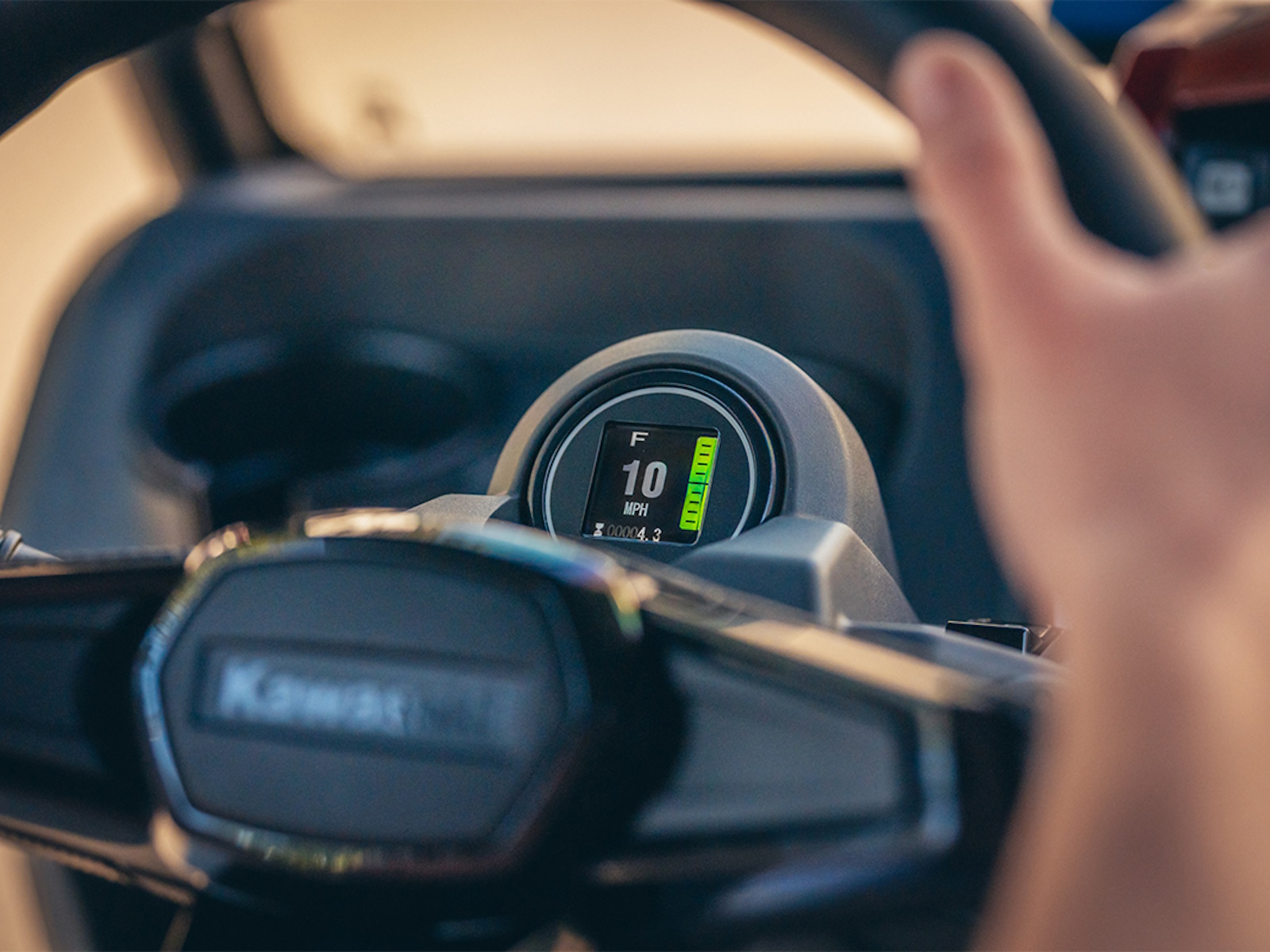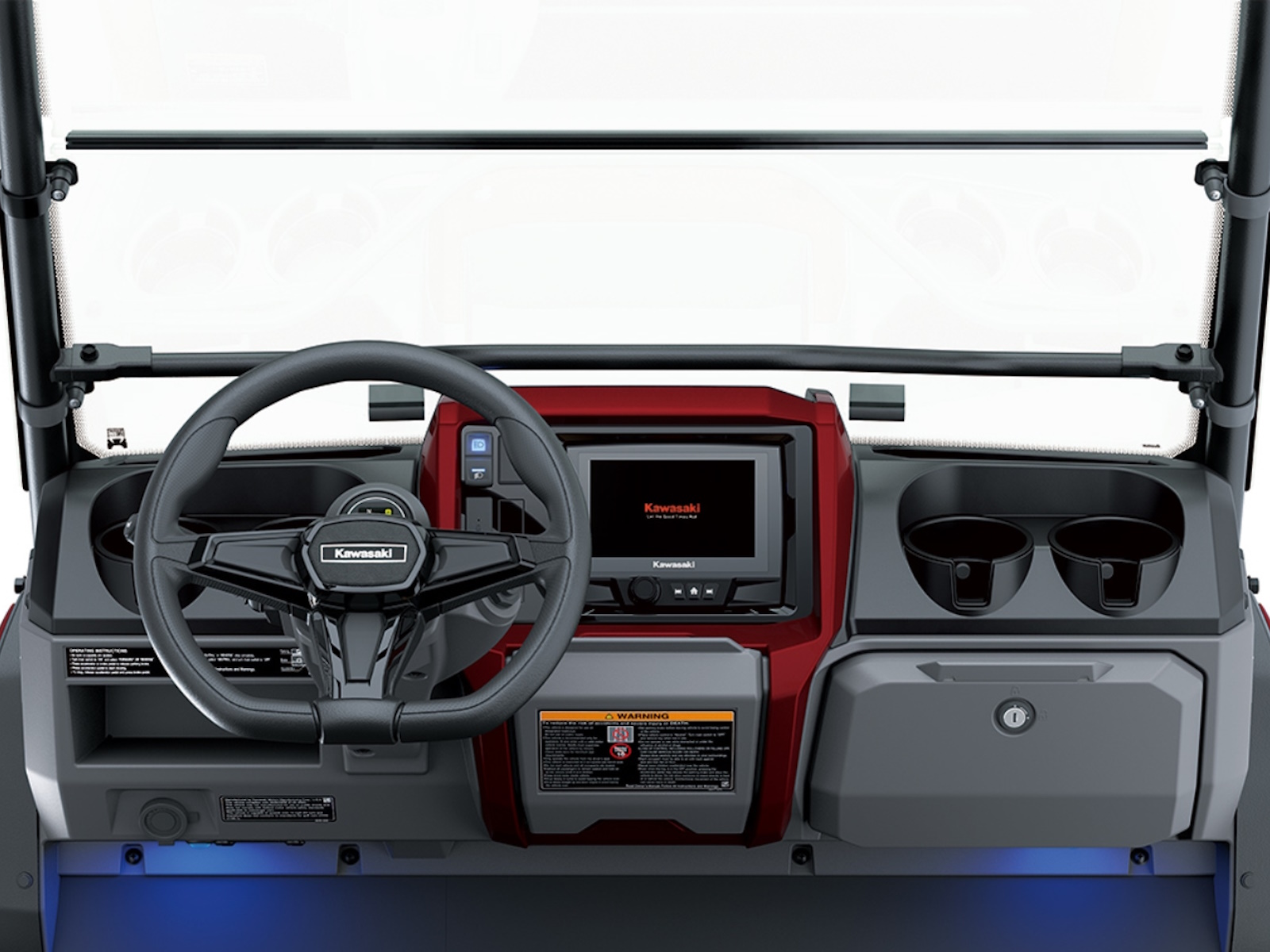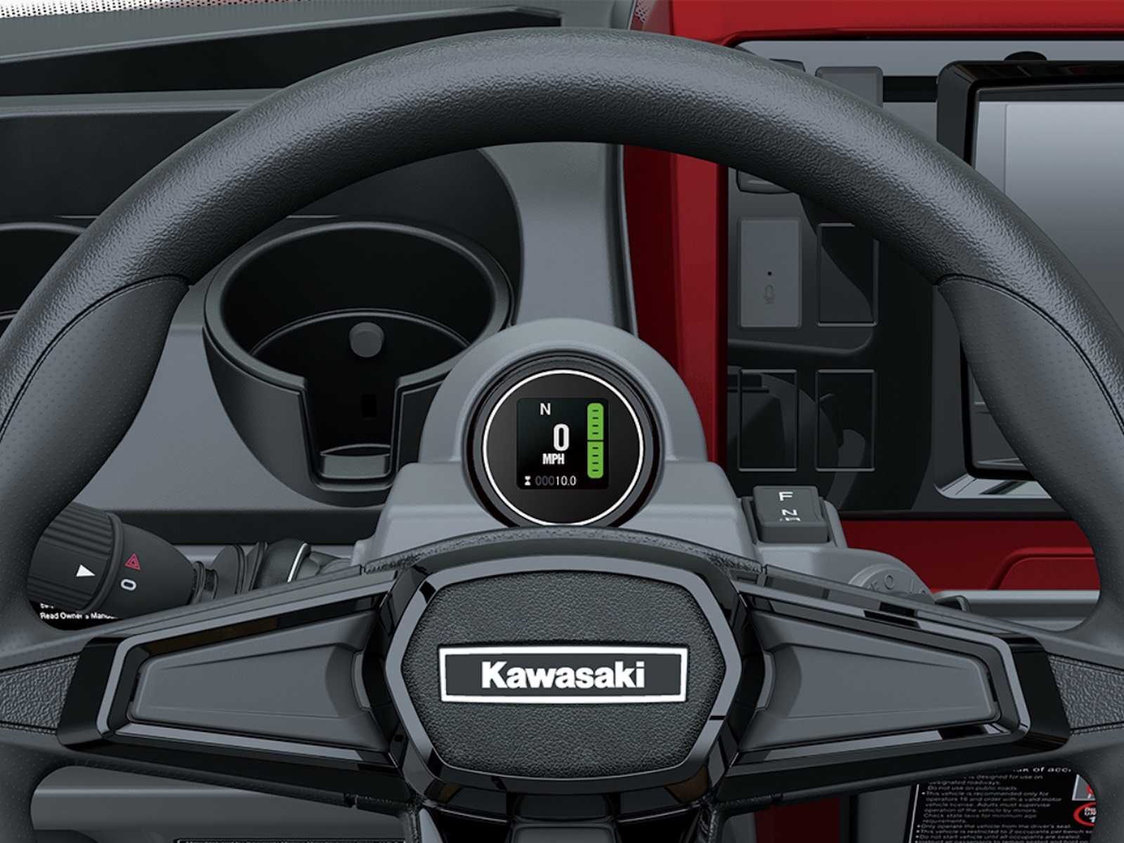 - Steering wheel features Kawasaki emblem and decorative covers
