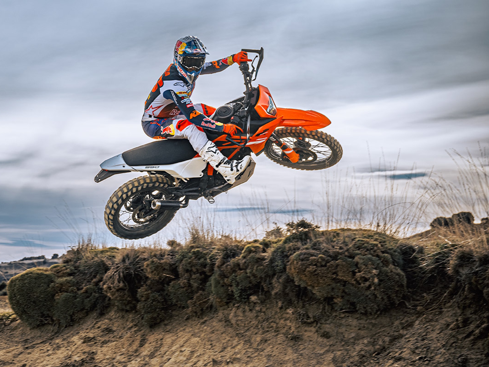 When deciding the ultimate route between points A and B, the KTM 390 ENDURO R owns every avenue. With exceptional, lightweight handling and punchy performance on both tarmac and dirt tracks, this middle-weight bruiser is ready to take on any road or commute. Packing state-of-the-art rider aids, adjustable suspension, and aggressive, enduro-inspired styling into a complete middle-weight package, the KTM 390 ENDURO R is ready for anything.