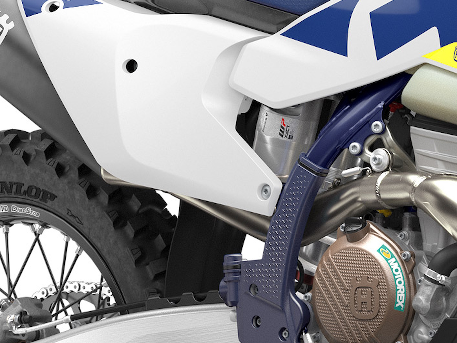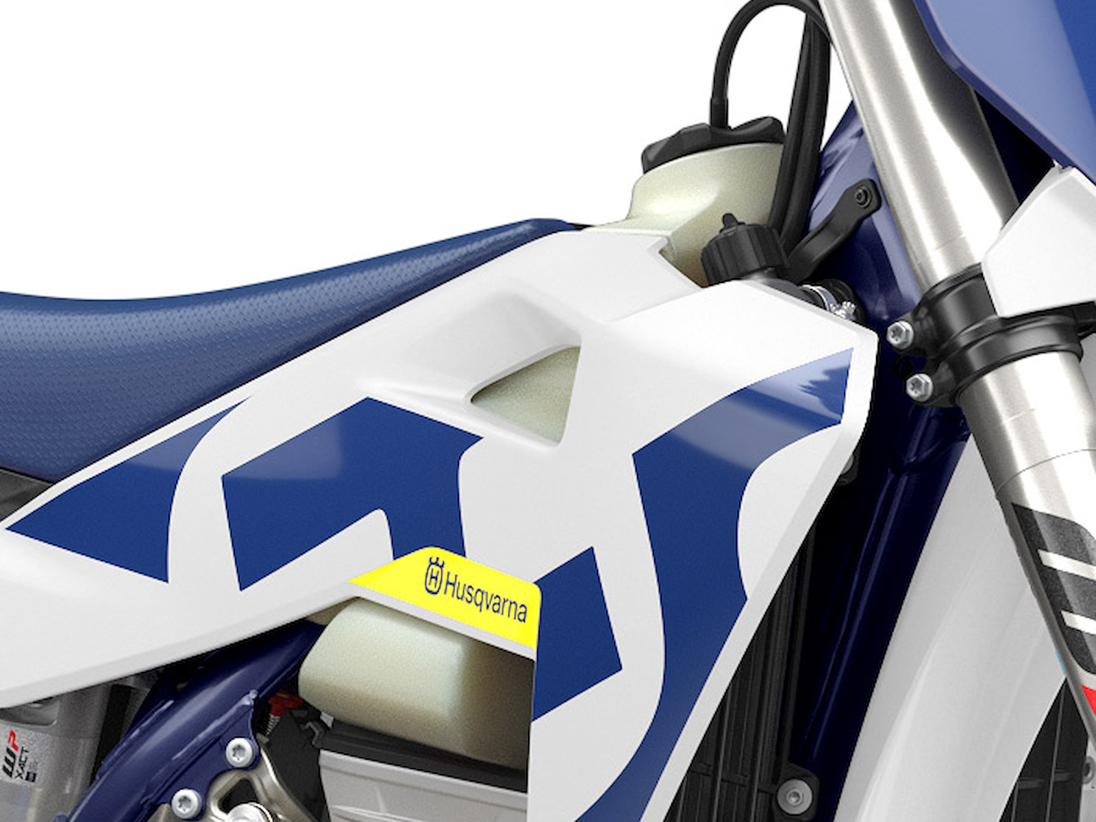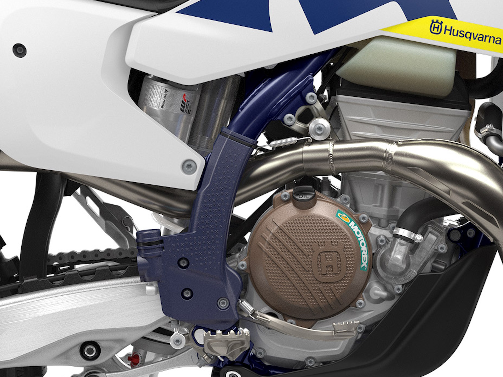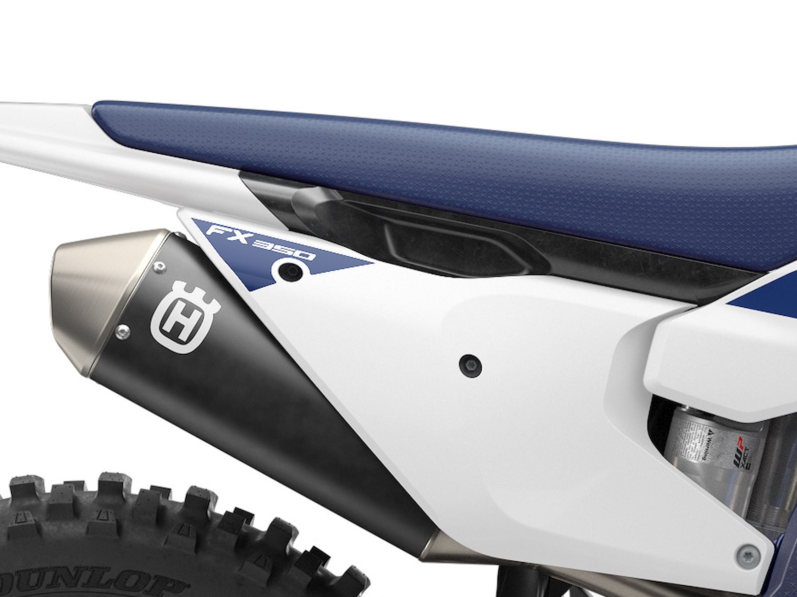 The FX 350 is the ultimate cross-country motorcycle. Its chassis delivers the agility of a 250, while the engine produces power comparable to a 450 for a perfect blend of rideability and performance. A close-ratio 6-speed gearbox, manufactured by Pankl Racing Systems, engages a specific engine map in each gear, which ensures a smooth delivery of power at all speeds. Assured comfort is provided by the WP suspension, which features settings developed for offroad riding, while smooth, ergonomic bodywork offers unrestricted movement for total control. The FX 350 features a distinctive colour scheme inspired by the brand's Swedish heritage, with graphics applied beneath the surface for a long-lasting finish.