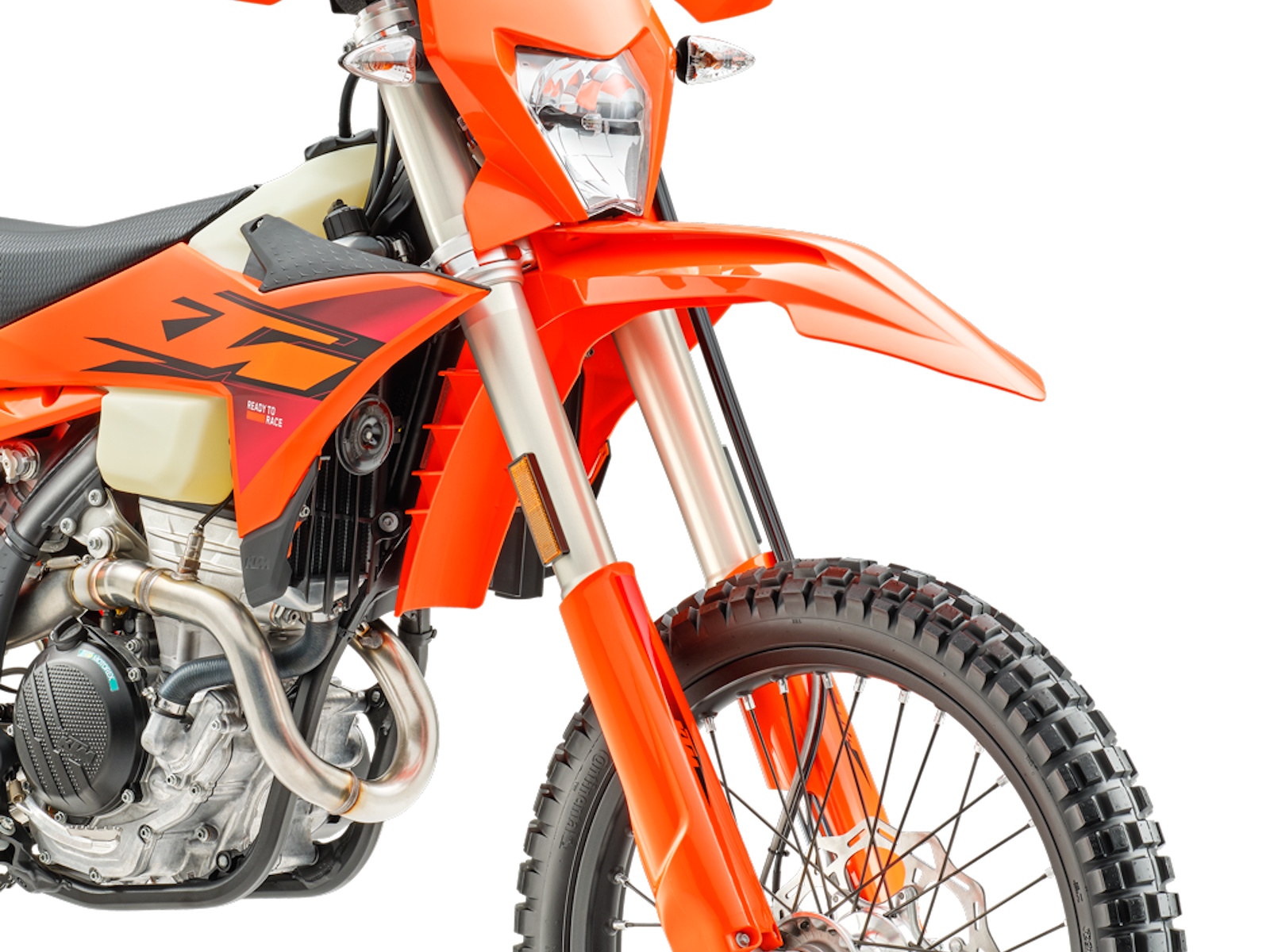 - The KTM Enduro range remains rock-solid at any speed thanks to a repositioned and forged steering head connection and CNC-milled triple clamps. Made from high-grade aluminum, these feature optimally tuned steering stem stiffness, perfect alignment of the fork tubes, and precise geometry of the fork clamps to ensure highly responsive and smooth fork action - not to mention unwavering stability for those ultra-fast flat-out special stages.