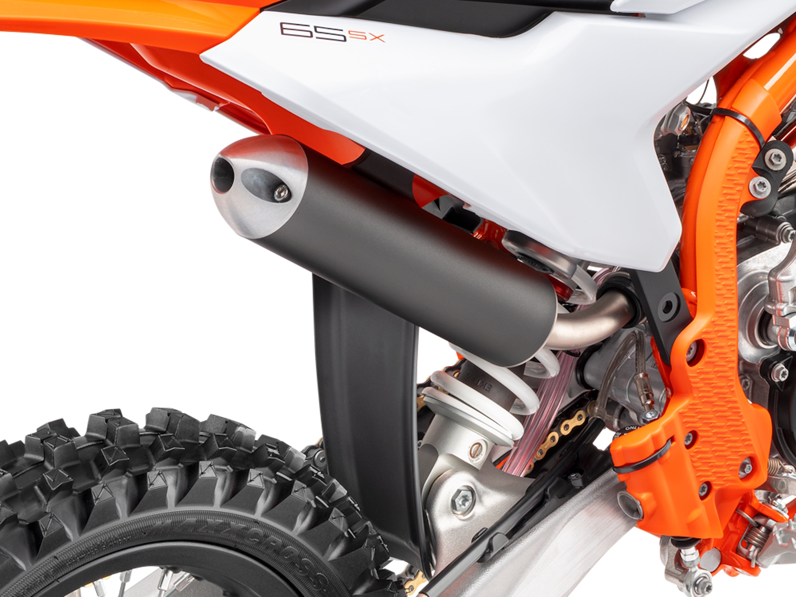 The exhaust system features the same manufacturing process as the full-size 2-stroke KTM SX range, with high overall quality and performance. This has resulted in massive progressions in thermodynamics. Moreover, improved sealing of the silencer end cap and a rubber between the header pipe and silencer add another level of quality to the exhaust system. The silencer comes with a black anodized finish and a signature 'Braaaaap!'. The modifications include a new flange gasket for better durability and the exhaust valve ventilation has been redesigned. It is more 'bulletproof' thanks to more efficient and locally sourced manufacturing at KTM HQ.