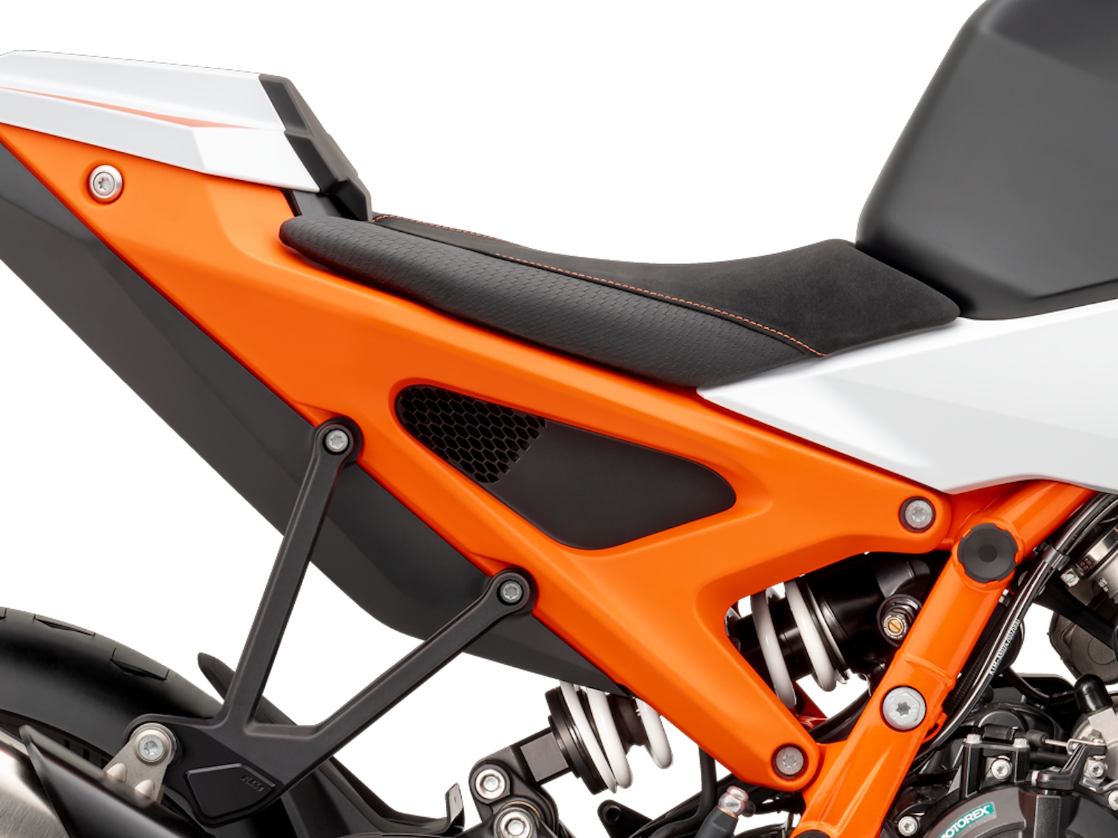 - The new WP APEX shock at the rear complements the fork to provide state of the art suspension. Specifically, travel at the rear has been reduced by 10 mm to 140 mm in comparison with the existing KTM 990 DUKE, excelling by virtue of a linear spring that maintains comfort in more relaxed environments. Also now with a longer wheelbase of 1,481 mm - increased by 5 mm the R has all bases covered.