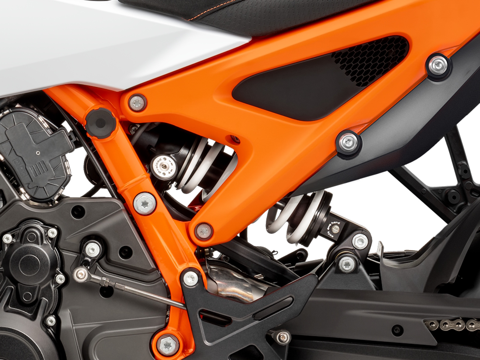- Torsional stiffness and rider feel were prioritized when developing the KTM 990 DUKE's tubular frame, which also forms the foundations of the R version. It's built with a sport-orientated personality, with both agility and stability combining to make for an immersive riding experience. An updated linkage mounting point has been introduced, without affecting the bike's value of stiffness. It also packs an aluminum die-cast subframe, which integrates side air intakes for form and function.