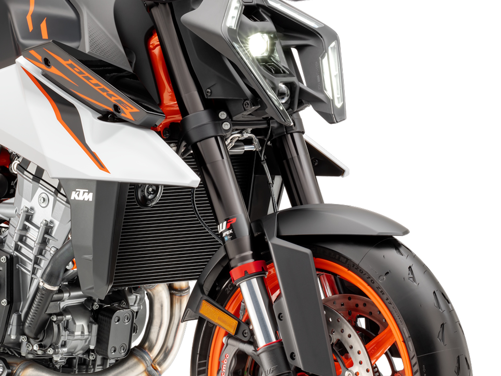 - Front-end feel takes on a new meaning when it comes to the KTM 990 DUKE R, highlighted by a 48 mm WP APEX Open Cartridge upside-down fork that has 143 mm of travel. It's no less than 34% stiffer and has upgraded settings that promote extreme performance, paired with a new forged aluminum triple clamps to match the flex of the fork. What riders can count on is a more planted feel and with better control. It's fully-adjustable, simple to dial in, and inspires confidence from the first time you drop into a turn.