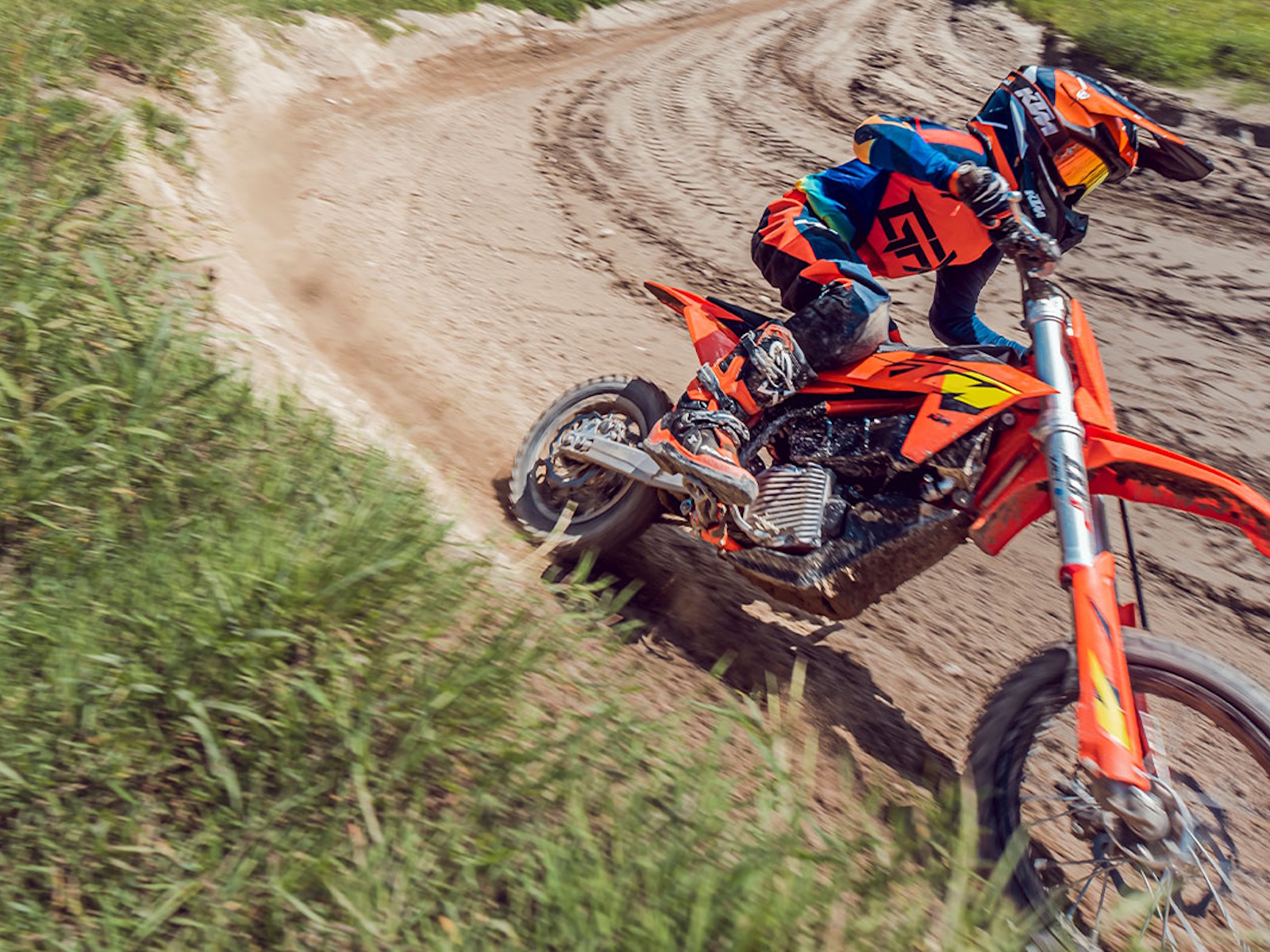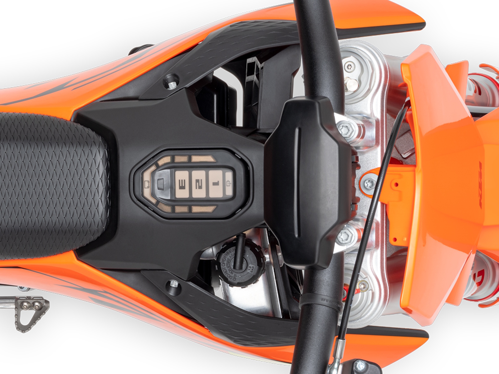 - The KTM SX-E 5 is fitted with a rollover sensor that cuts off the power in the event of a fall. For further safety measures, the ride modes can be locked and saved with a dongle located below the seat. This prevents younger, less experienced riders from changing to more powerful ride modes on their own.