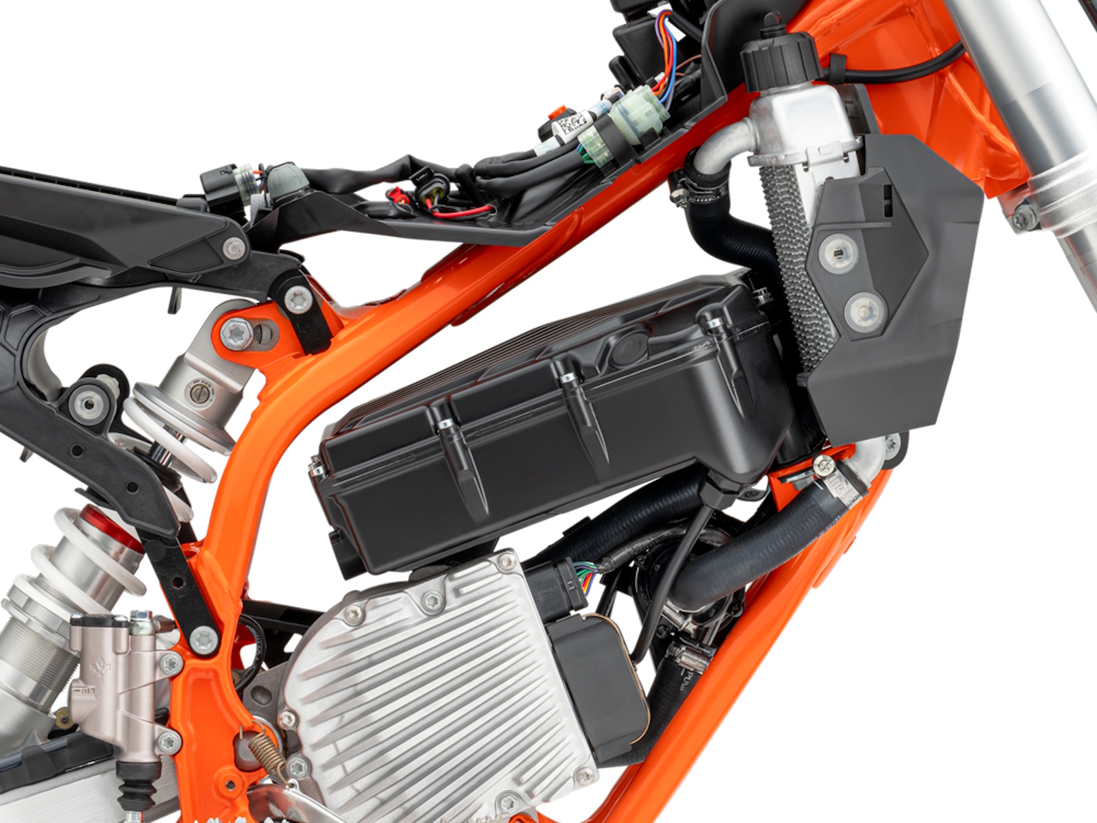 - The KTM SX-E 5 is fitted with 84 modern lithium-ion cells in a robust die-cast aluminum casing that is mounted just above the electric motor. This means the stored energy is 907 Wh, which is enough for more than two hours of riding for a beginner and approximately 30 min full-throttle racing, depending on conditions and terrain. The integrated battery management system (BMS) ensures the safety and longevity of the battery pack. Charging time has been reduced, with 0-80% capacity achievable in 45 minutes while 0-100% is possible in just 70 minutes.