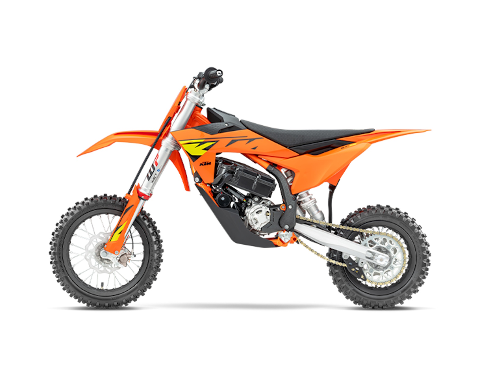 - The KTM SX-E 5 boasts a fully adjustable, upside-down WP XACT air fork with a 35 mm tube diameter and 205 mm of travel. This ensures outstanding comfort, damping characteristics, and directional stability. Another main benefit for junior riders is that the air spring fitted in the left fork leg can be adjusted perfectly to the rider's weight using a simple air pump.