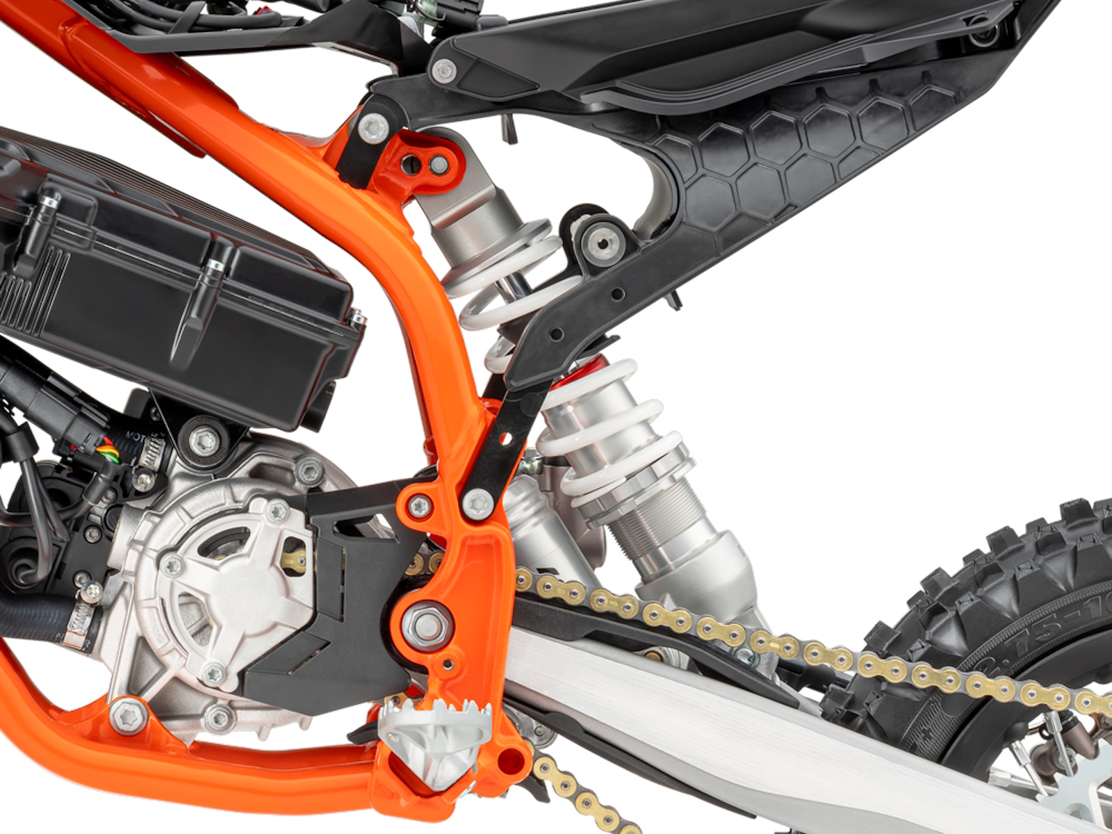 - The KTM SX-E 5 frame is forged from lightweight, high-strength Chromoly steel profiles and combines maximum longitudinal stiffness with optimum torsional rigidity. The modification provides more robustness, handling and a tougher rear shock mounting point. The subframe is made of lightweight, fiberglass reinforced plastic, which can be mounted in diffrent positions for different seat heights. This means that the KTM SX-E 5 can 'grow' with your young racer.